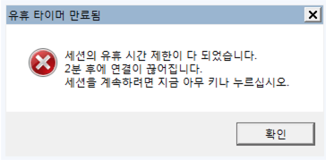 유휴 시간 이 다가오면 아래와 같이 알럿이 나온다.