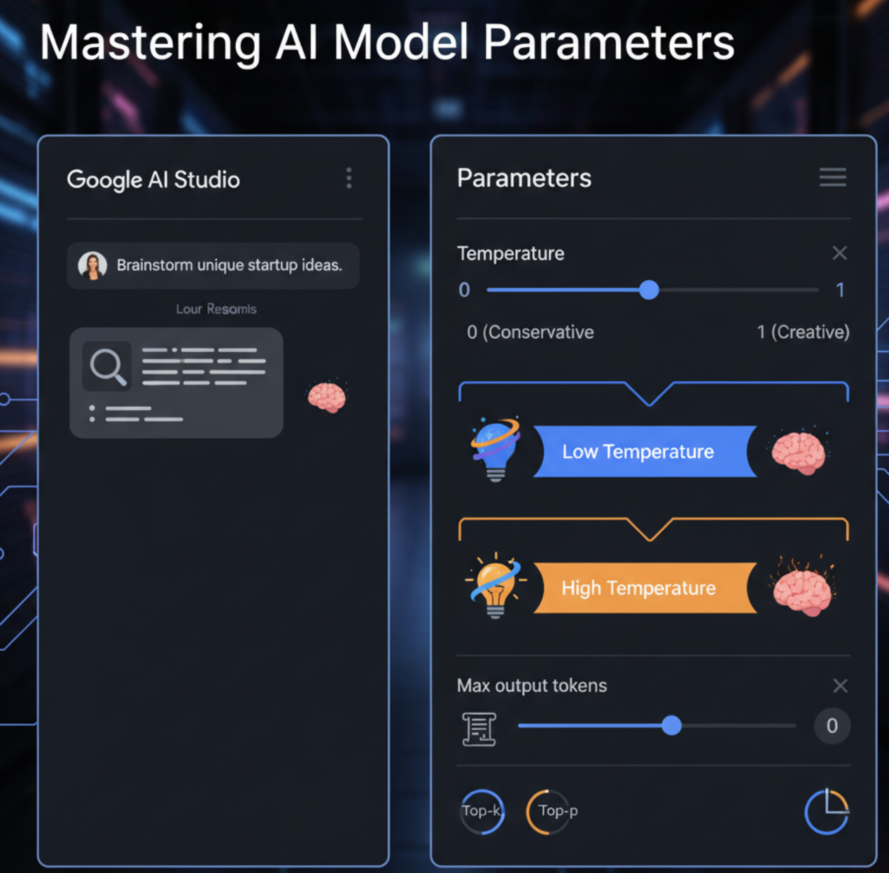 Google AI Studio는 AI 모델의 응답 방식을 조절할 수 있는 '매개변수(Parameters)' 설정을 제공합니다. 비전공자도 쉽게 이해하고 조절할 수 있습니다. 화면 오른쪽에 있는 '매개변수(Parameters)' 패널을 확인해보세요.
