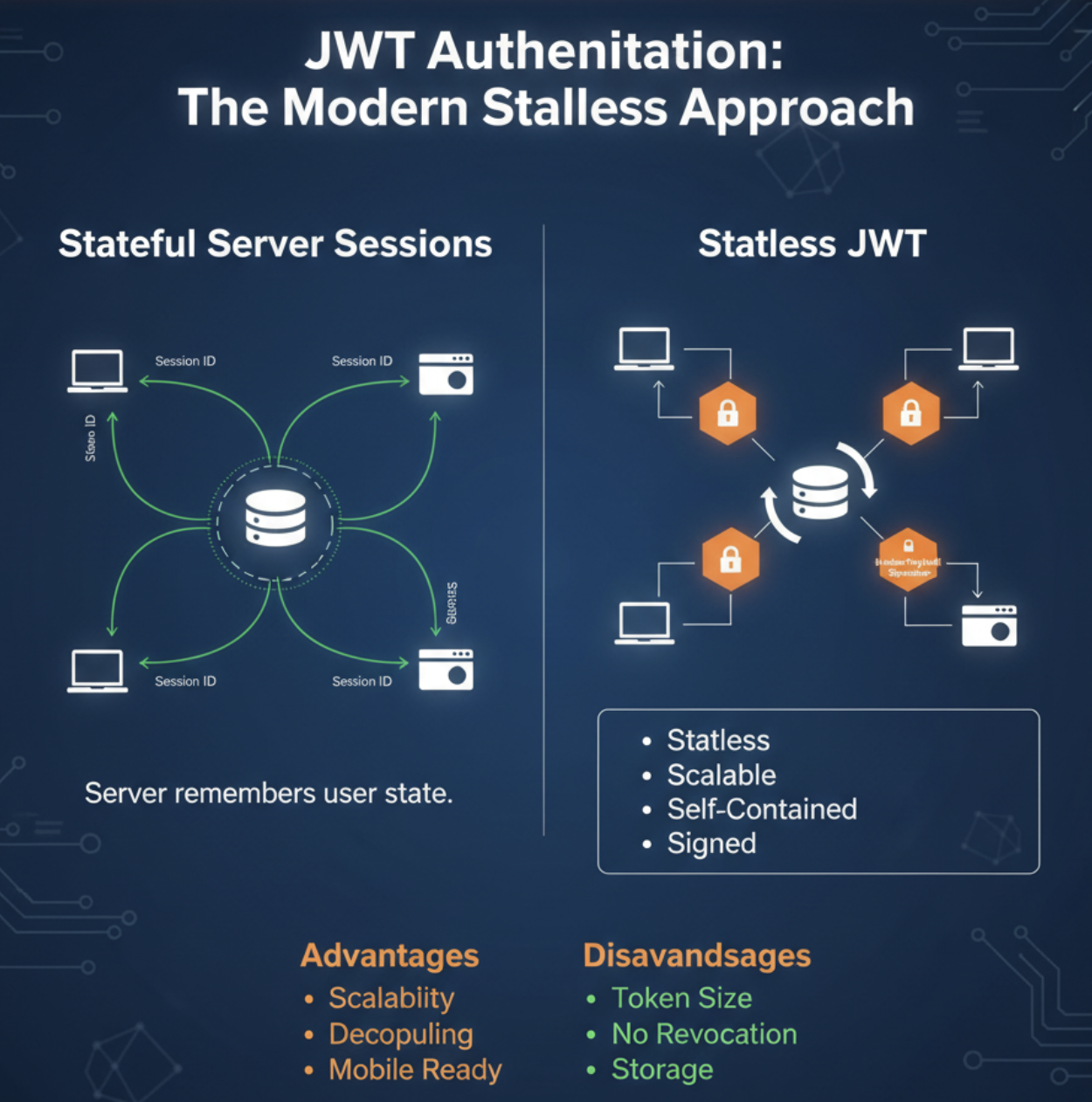 - 모바일/API 환경 부적합: 전통적인 세션 방식은 웹 브라우저의 쿠키에 의존하므로, 쿠키를 사용하기 어려운 모바일 애플리케이션이나 순수 API 서비스에서는 활용하기 어렵습니다.
