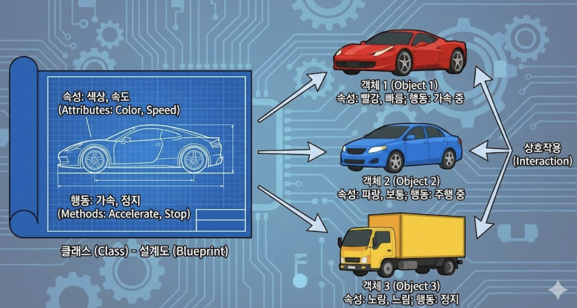 - 클래스 (Class): 객체를 만들기 위한 '청사진' 또는 '설계도'입니다. 클래스는 특정 종류의 객체들이 가져야 할 공통적인 속성과 행동을 정의합니다. 예를 들어, '자동차 클래스'는 모든 자동차가 가져야 할 기본적인 속성(색상, 제조사, 모델명 등)과 행동(시동 걸기, 주행하기 등)을 정의하고, 이를 바탕으로 수많은 실제 자동차 객체(현대 아반떼, 테슬라 모델3 등)를 만들어낼 수 있습니다.