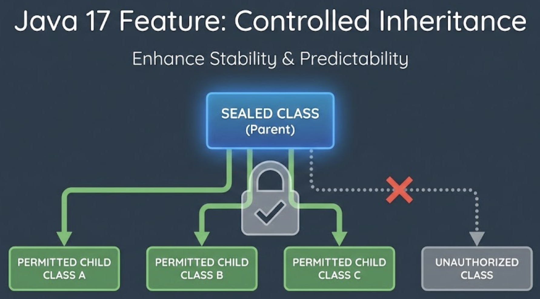 이러러한 배경 속에서 자바 개발자들은 클래스 계층 구조를 더욱 세밀하게 통제하고, 개발자가 명시적으로 허용한 특정 서브클래스들만 상속받을 수 있도록 하는 메커니즘의 필요성을 강하게 느끼게 되었습니다. 이것이 바로 자바 17에서 표준화된 Sealed Class의 핵심 등장 배경이자 목적입니다. Sealed Class는 이름 그대로 '봉인된 클래스'를 의미하며, 특정 클래스나 인터페이스를 상속받거나 구현할 수 있는 클래스들을 명확하게 지정합니다.